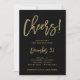 These modern, faux gold and black New Year's Eve party invitations feature glam gold script typography that says "cheers!" This minimalist yet elegant design is the perfect way to invite guests to your New Year's Eve 2020 celebration.