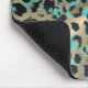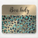 Blue and black leopard dots on a shimmery gold backdrop with a gold pearl necklace border where above is a gold shiny edge where you can personalise it with a name, phrase or logo or you can keep it as is with the words "Boss Lady". Chic glam leopard theme.