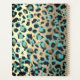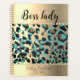 Blue and black leopard dots on a shimmery gold backdrop with a gold pearl necklace border where above is a gold shiny edge where you can personalise it with a name, phrase or logo or you can keep it as is with the words "Boss Lady". Chic glam leopard theme.