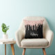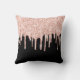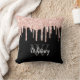 Stylish monogrammed glitter drip throw pillow - Layered pink glitter drips on a black background with a customisable white script name template and bold monogram in grey.