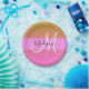 Girly and glam hot pink and orange, yellow, gold mermaid glitter sparkles gradient monogram name and initial paper plate. Your custom name and monogram are written in an elegant hand lettered script with a pink background.