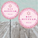 These personalised pink glam round stickers are easy to customise and make a great addition to your Bat Mitzvah party favours. Set on a pale pastel pink background and rimmed in a faux pink glitter, all four text templates in dark rose pink can be edited with your preferred wording for the perfect sticker. Finished with a faux pink glitter Star Of David at the top, these custom stickers are ready to help with your Bat Mitzvah planning.
