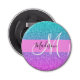 Girly and glam purple, lilac, aqua and turquoise mermaid glitter sparkles gradient monogram name and initial bottle opener. Your custom name and monogram are written in an elegant hand lettered script with a pink background. A perfect birthday or Christmas gift!