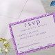 Complete your Bat Mitzvah invitation suite with these elegant purple glam RSVP cards that are easy to customise. The front of each purple Bat Mitzvah RSVP card is bordered by faux purple glitter and an inset frame in deep royal purple. Matching dark purple text in modern fonts on a pastel purple lavender background allows you to include your wording for the reply cards along with the date of your event. Each card reverses to a solid dark royal purple background with RSVP in a bold modern script font and a purple faux glitter Star Of David at the top.