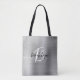This elegant personalised tote bag features a monogram and first name in modern black and white script on a glam silver brushed metal background.