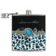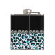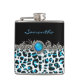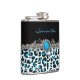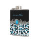 Chic lady's flask done in black, on top, and a turquoise blue, white, and black spotted snow leopard pattern, on the bottom. Graphics of an ornate diamond looking border, with a turquoise blue bauble, runs across the middle of the case bordering the animal pattern. Blue coloured text is ready to personalise, for yourself or as a elegant gift for her.