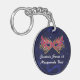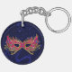 Festive Masquerade Ball Sweet 16 birthday party key chain favour. Graphics of an ornate face mask decorates the dark blue starry background, on both sides. Text in white, on the front, is fully customisable for you to personalise for your event.