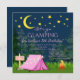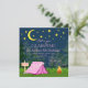Glamping birthday party invitations with a cute pink tent on a nighttime forest background. These cute girls camping birthday party invitations are easily customised for your event by simply adding your details in the font style and wording of your choice.