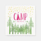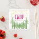 A rustic yet chic personalised sticker for a "Glamping" themed party complete with a tent in a forest of trees under faux foil gold stars.