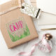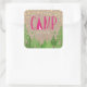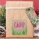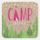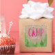 A rustic yet chic personalised sticker for a "Glamping" themed party complete with a tent in a forest of trees under faux foil gold stars.