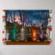 Glass Bottles in Window full of Raindrops Poster