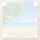 Glass coaster shown with a photo print of a pretty tropical beach scene with palms.