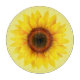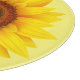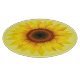 Glass cutting board is shown in a round style in a lovely sunflower print.