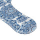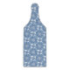 Glass cutting board is shown in a paddle style in a blue faux tile print.