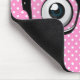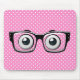 Black frame eyeglasses with eyeballs on white polka dots and pink background.