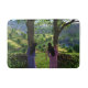 Twin young ladies peer out from behind two trees down into a lush green glen between rocky hills, filled with little farms and hedgerows and stone walls and watered by a sparkling stream that cascades down the hills.