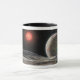 Gliese 581 c, shown from the perspective of a possible moon, is thought to be a rocky world about 1.5 times the radius of Earth. Its temperature is uncertain, yet it resides near the star’s habitable zone, making the existence of oceans and lakes a possibility. From a mixed media illustration created for “The Search for a World Like Our Own: Imagine Earth 2.0,” at swissnex San Francisco on May 15, 2008. The original art is in a private collection.