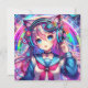 Personalised girl's birthday party invitations. Anime glitchcore girl with headphones and fox ears colourful purple, pink, blue and green ai art.