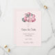 Save the date card with an illustration of a bunch of balloons in pink and silver grey colours.