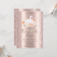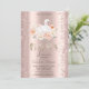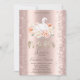 A modern, chic, and glamourous with glitter confetti, and floral baby swan on a rose gold background.