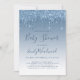 This trendy baby shower invitation features a border of sparkly blue dripping faux glitter on a blue ombre background. The words "Baby Shower" and the name of the mum-to-be appear in blue handwriting script, with the remaining text in blue sans serif font.