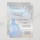 Elegant blue dress, Eiffel tower and silver glitter drips on a silver background.