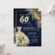 Elegant gold dress, sunflowers and gold glitter drip on a navy blue background.