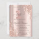 A modern, chic and glamourous invitation with glitter drips and silver tiara on a rose gold background.