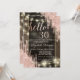 A modern, chic, and glamourous with glitter drips, and string lights on a rose gold background.