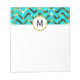 A faux shiny print background of golden and aqua zigzag stripes has a white circle edged with gold on which a template for your monogram rests.