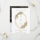 An elegant rustic wedding save the date announcement featuring a faux gold glitter geometric frame with watercolor black olives and green leaves. Personalise with your details in green font and add your photo to the reverse.