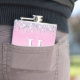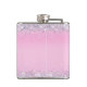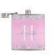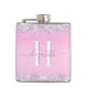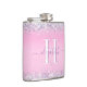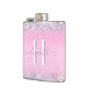Monogrammed girly flask with sparkly holographic purple and silver faux glitter confetti along the top and the bottom against a pink background. You can add your monogram initial and your name in a trendy purple script with swashes.