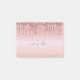 Personalised chic post-it notes featuring sparkly pink faux glitter dripping from the top against a pink and rose gold background. You can add your initial and name in trendy typography with swashes.