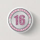 Pink Sweet Sixteen (16) milestone Birthday buttons featuring a printed glitter illustration for the "16" in a "SWEET SIXTEEN CELEBRATION" emblem design.
