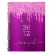 A stylish girly and feminine deep purple faux metallic, foil looking background with hot pink faux glitter drips, dripping, drips. Personalise and add your name, monogram letter and a year. The year upside down. The name is written with a large trendy hand lettered script with swashes. To keep the swashes only delete the sample name, leave the spaces or emoji's in front and after the name. Light pink and purple letters.