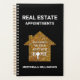 Stylish black and gold Glitter REAL ESTATE Appointments Planner with CUSTOMIZABLE TEXT, designed to keep record of all the appointments you'll be making from your many referrals. TEXT IS CUSTOMIZABLE so you can personalise the wording to suit your preference. The text reads REAL ESTATE and APPOINTMENTS. The text inside the faux gold glitter house reads BLESSINGS ON YOUR NEXT NEW HOME in white typography. The O of HOME is replaced with a key. This realtor planner would be a great addition to your realty business. Choose from a wide selection of real estate designs for your solopreneur or agency business, designed on a range of products by Berean Designs.