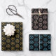 Glitter snowflake pattern black Christmas holiday Wrapping Paper Sheets. Each sheet features a pattern of snowflakes in gold, rose gold and blue glitter on black background.