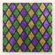 A vibrant Mardi Gras poster with shiny green, purple, and golden glittering diamonds.