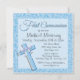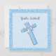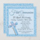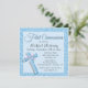 Pretty blue faux sequin first communion invitation. Features a pretty sparkling cross with satin bow against a light blue and white stria background. Hand drawn illustration by McBooboo.