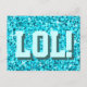 Postcard with a modern design featuring stars scattered over a stylised "sequin look" pattern background and 'LOL!' in shades of blue. Can be used as a background for your own text, images and ideas. Please note this is a printed digital art image, it does not shine or contain real glitter or sequins.