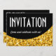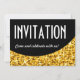 Invitation with a modern design featuring stars scattered over a stylised "sequin look" curved shape in shades of yellow gold set against a black background with 'Invitation' 'come and celebrate with us!' written in white. Can be used as a background for your own text, images and ideas. The text can easily be changed using the template provided or click the 'Customise It' button to make further alterations. Please note this is a printed digital art image, it does not shine or contain real glitter or sequins.