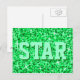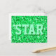 Postcard with a modern design featuring stars scattered over a stylised "sequin look" pattern background and 'STAR' in shades of green. Can be used as a background for your own text, images and ideas. Please note this is a printed digital art image, it does not shine or contain real glitter or sequins.