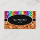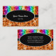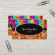 Business card with a modern design featuring stars scattered over stylised "sequin look" rainbow-coloured stripes on an orange background, with text written in white on a black oval shape. A customisable design for you to personalise with your own text, pictures and ideas. Please note that this is a printed digital art image and does not contain real glitter or sequins