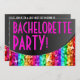 Invitation with a modern design featuring stars scattered over a stylised "sequin look" rainbow-coloured striped curved shape and 'Bachelorette Party!' in shades of pink on a black background. Can be used as a background for your own text, images and ideas. The text can easily be changed using the template provided or click the 'Customise It' button to make further alterations. Please note this is a printed digital art image, it does not shine or contain real glitter or sequins.