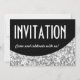 Invitation with a modern design featuring stars scattered over a stylised "sequin look" curved shape in shades of silver grey set against a black background with 'Invitation' 'come and celebrate with us!' written in white. Can be used as a background for your own text, images and ideas. The text can easily be changed using the template provided or click the 'Customise It' button to make further alterations. Please note this is a printed digital art image, it does not shine or contain real glitter or sequins.