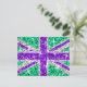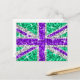 Fly the UK flag with a twst! A fun Union Jack design featuring stars scattered over a stylised "sequin look" pattern background. Postcard with a purple, white, silver grey and green customisable design for you to personalise with your own text, pictures and ideas. Please note this is a printed digital art image, it does not shine or contain real glitter or sequins.