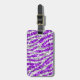 Luggage tag with a modern printed design featuring stars scattered over a stylised "sequin look" zebra stripe pattern background. Your choice of text is written in white on a purple background. A customisable design in shades of purple and silver grey for you to personalise with your own text, pictures and ideas. Please note this is a printed digital art image, it does not shine or contain real glitter or sequins.