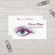Eye catching cosmetology business cards for the eye extensions specialist featuring a gorgeous blue eye with purple faux glitter eyelashes. personalise by adding your name and speciality. Flat printed image, NOT reflective glitter.