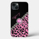 Glamourous Samsung Galaxy Note 4 case done in black, with a spotted pink and black jaguar print running diagonally across the bottom right side of the case. Graphics of a diamond border, on the edge of the jaguar print, has a pink and silver tone gem, in the middle. Personalise the pink text for yourself or as a purrfect gift idea.
