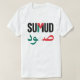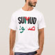 A bold, modern poster-style t-shirt design with the text "GLOBAL SUMUD FLOTILLA" at the top and "GAZA" at the bottom in powerful sans-serif letters. In the centre, a large ship sails forward on stylised ocean waves, with a flowing Palestinian flag on its mast. The background features a radiant sunrise with golden rays, symbolising resilience and hope. Olive branches subtly frame the sides of the composition. The style is clean vector art with flat, vibrant colours (red, green, black, white, blue, gold). The design should feel iconic, minimalist, and suitable for screen-printing on fabric.